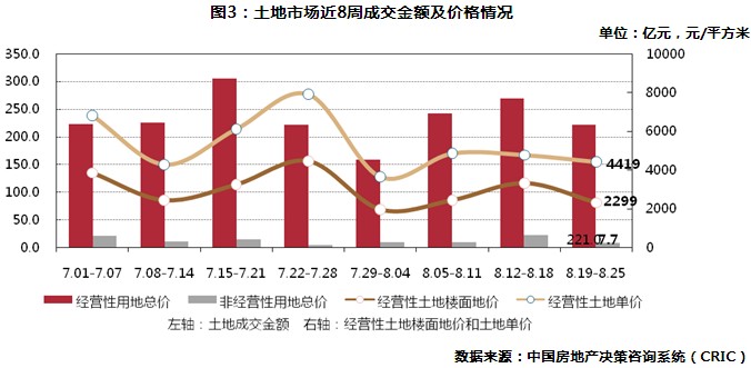 本周土地成交總金額229億元,環(huán)比下降21.7%。其中,經(jīng)營(yíng)性用地221.0億元,環(huán)比下降18.0%;非經(jīng)營(yíng)性用地7.7億元,環(huán)比下降65.7%。本周經(jīng)營(yíng)性土地成交均價(jià)4419元/平方米,環(huán)比下降7.4%,成交樓面均價(jià)為2299元/平方米,環(huán)比下降30.5%。